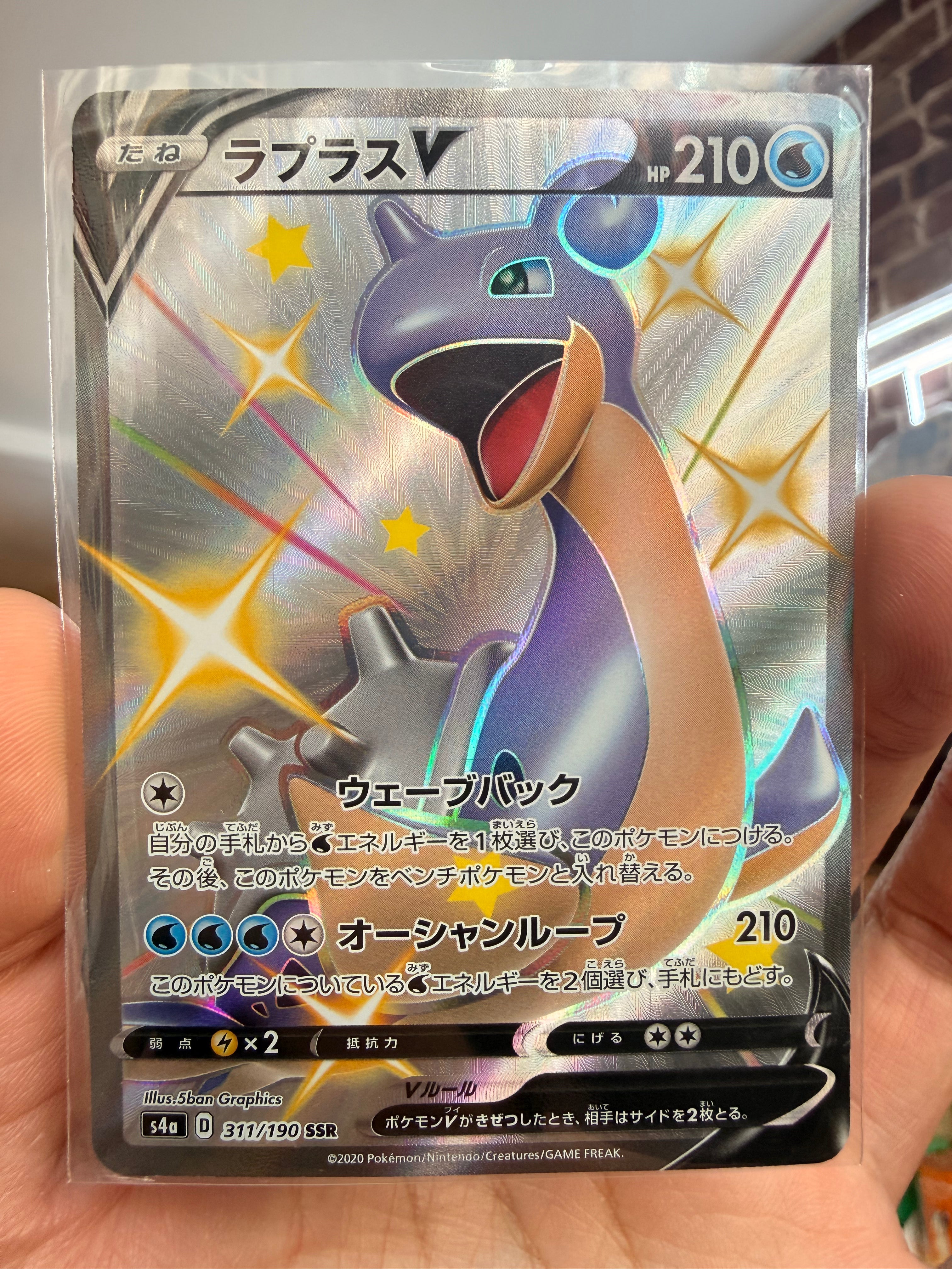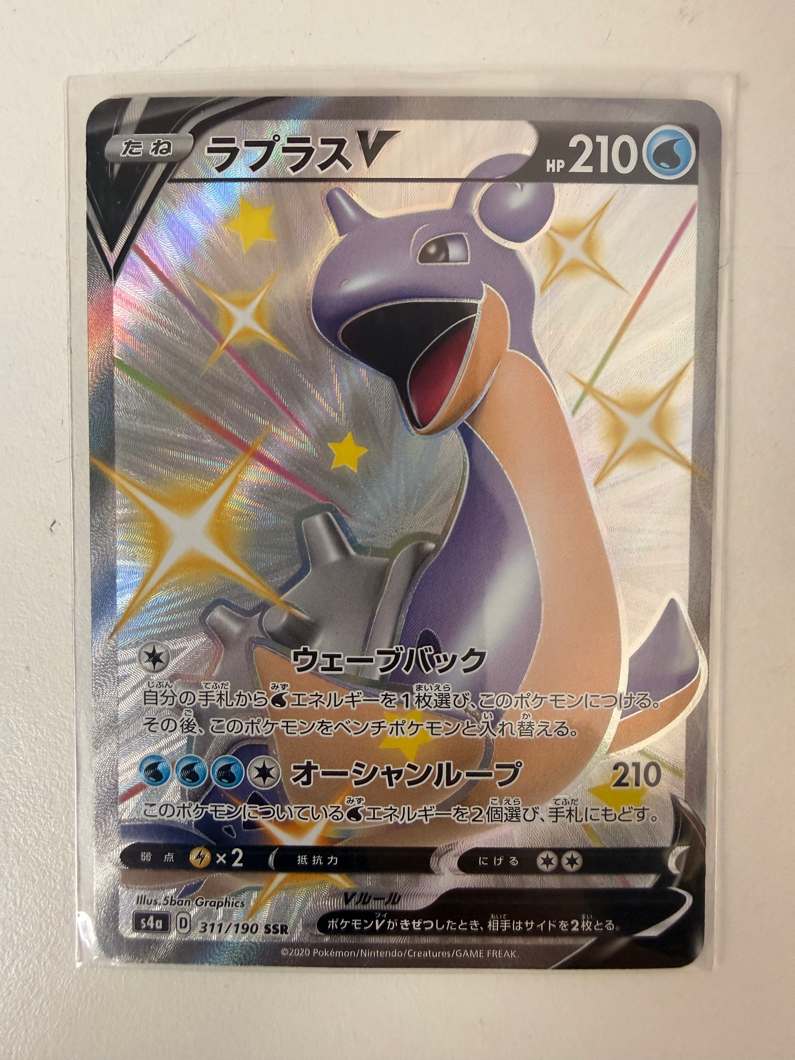 Hunt down one of the most iconic Gen 1 Pokémon in its rare "Shiny" form! This Lapras V SSR (311/190) is from the legendary Shiny Star V (s4a) high-class pack. Known for its breathtaking silver holographic texture and the unique purple color scheme of a Shiny Lapras, this Shiny Super Rare (SSR) card is a centerpiece for any serious Japanese TCG collection.